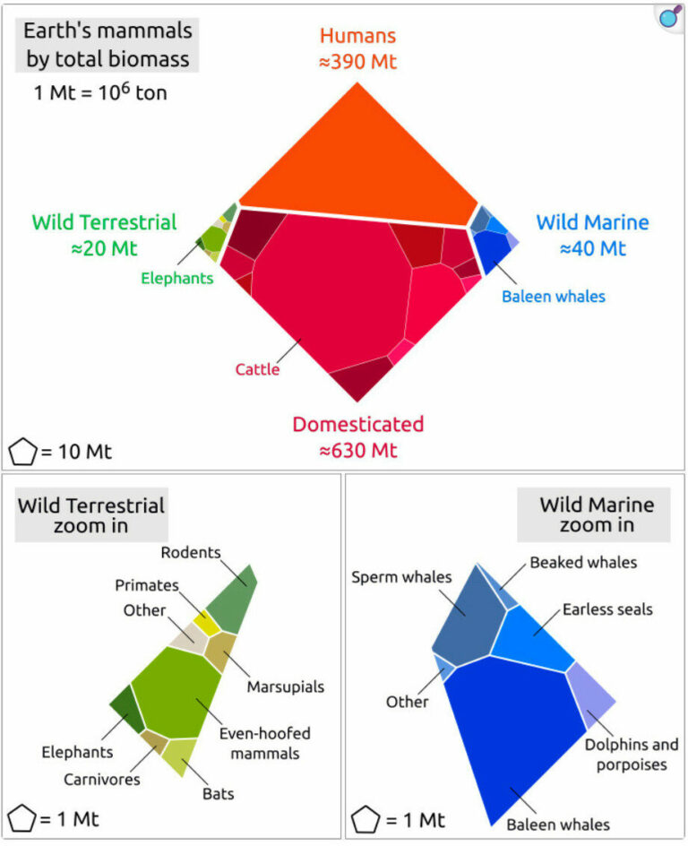 Een van de manieren om dit weer te geven is om de hoeveelheid biomassa te meten. Hoeveel kilogram dier is er? Als dit wordt gemeten van alle zoogdieren, ziet dat er zo uit: